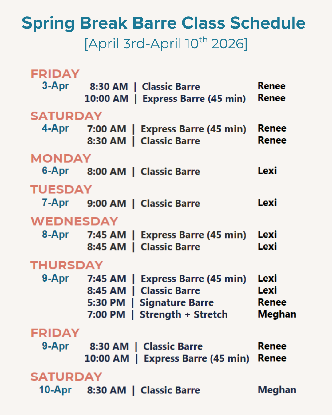 Modified Spring Break schedule - regular class rotation will resume on Monday, April 13th - online booking and app are updated in real time